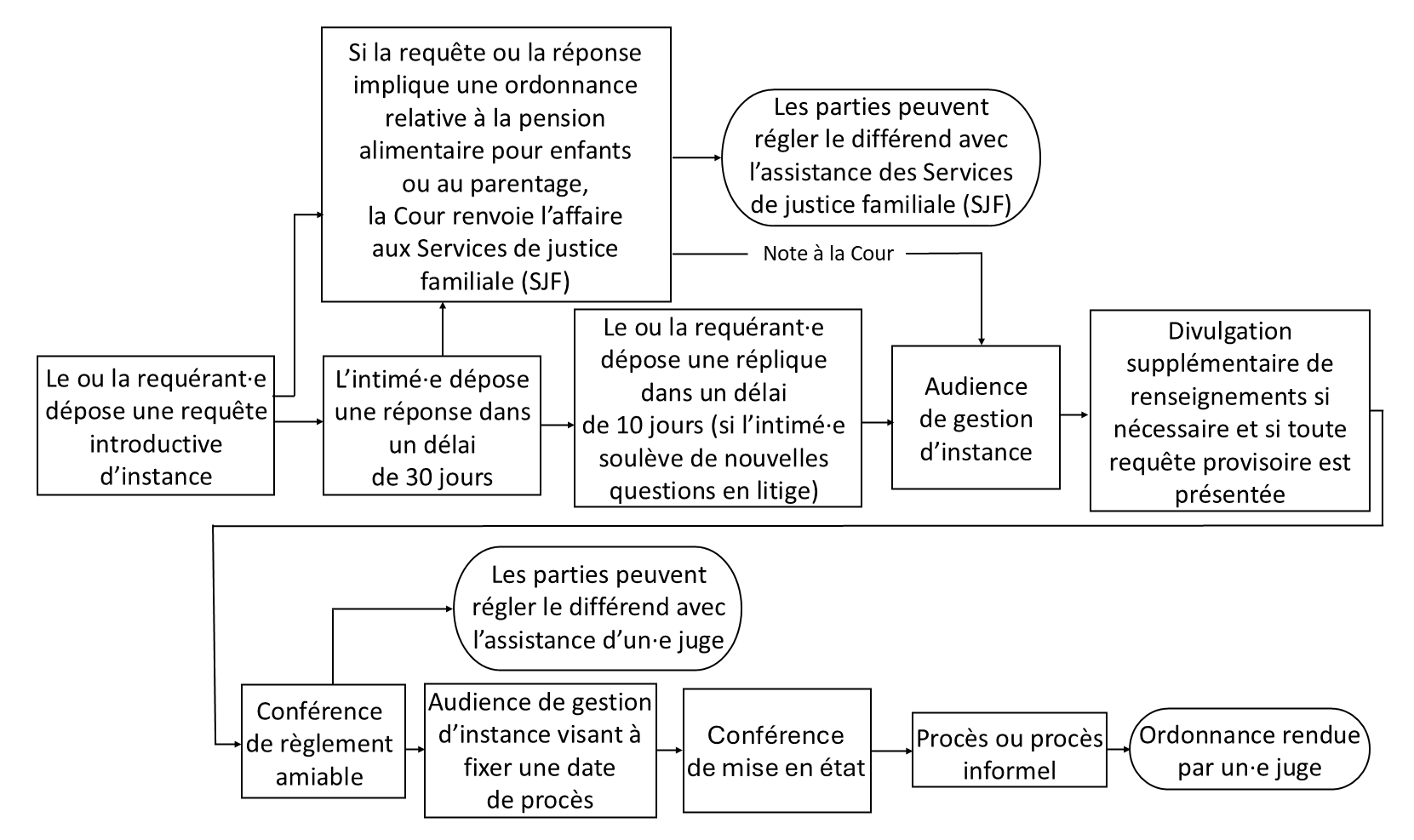 Le diagramme ci-dessous décrit le processus que suivent généralement les instances familiales avant d’aboutir à une ordonnance du tribunal.